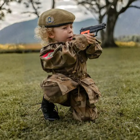 Kinder spielen im Spiel nicht einfach nur nach, sie verarbeiten dabei auch, was sie beängstigt und schlüpfen dazu auch gern in die Rollen derer rein, die „für Ordnung“ sorgen. So erleben sie sich als stark und können ihre innere Welt immer wieder als stimmig erleben: der Dieb ist im Gefängnis gelandet. Und klar braucht man dazu auch Spielzeug-Waffen.